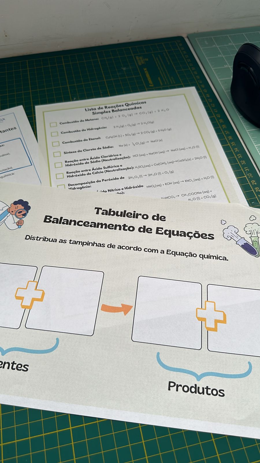 O material em PDF com 48 páginas é uma proposta de material sobre a temática Reações Químicas e Balanceamento de Equações. O material acompanha atividades em diferentes formatos, incluindo práticas digitais usando simuladores e um mapa mental sobre a temática. O material conta com instruções, sugestões de gabarito e versões colorida e preto e branca das atividades.