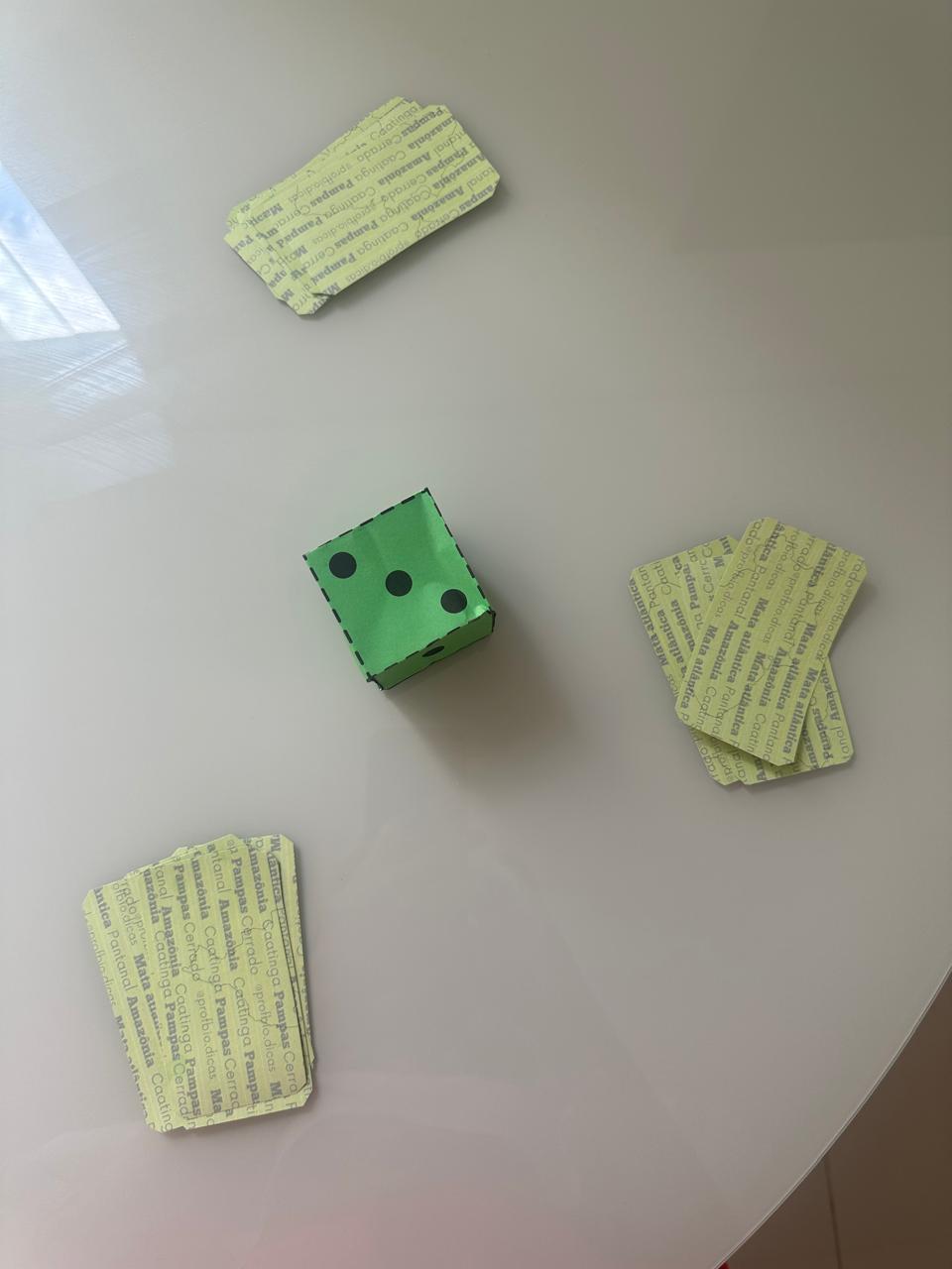 Acompanha regras e instruções para o professor. Possui caixa para guardar o material, folha para o verso das cartas e dado para escolha da ordem de inicio no jogo.
