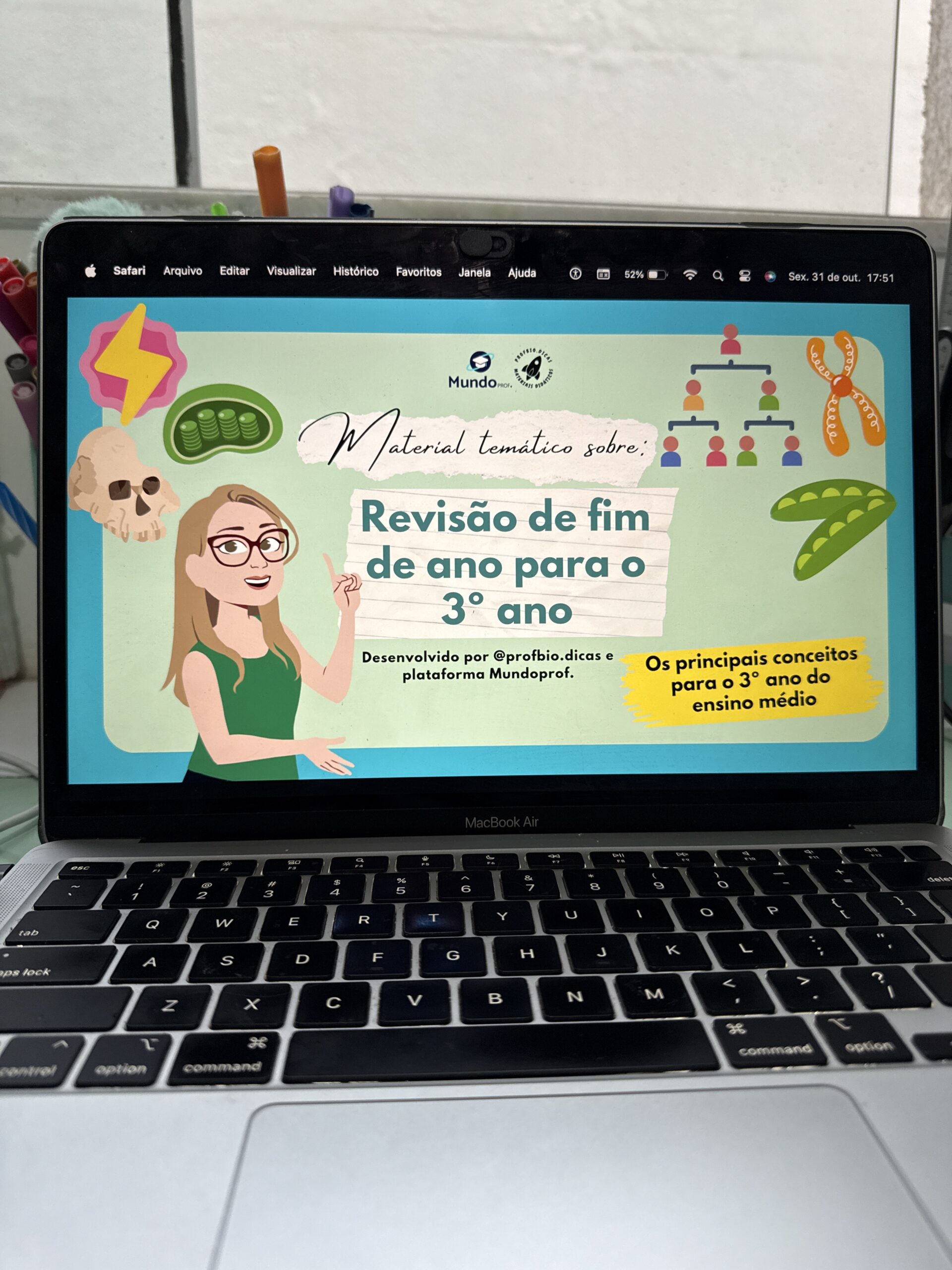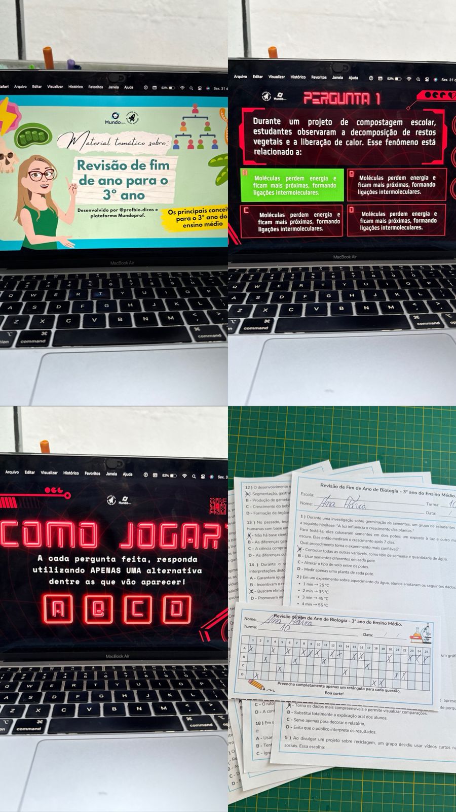 Além da versão para impressão, cada material inclui um slide interativo em PPTX dentro do PDF com cerca de 80 páginas, transformando as mesmas perguntas em um jogo gamificado para tornar a revisão mais dinâmica.