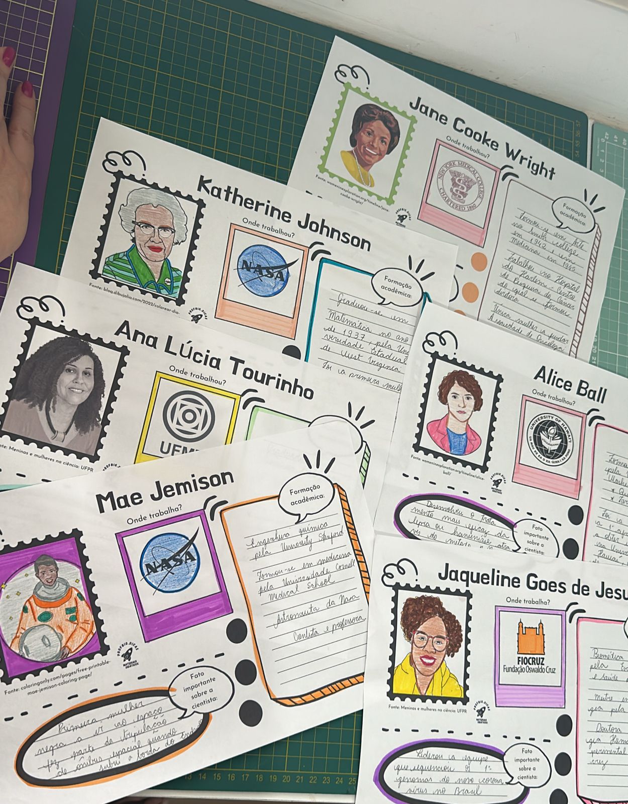 Mulheres: Ana Lúcia Tourinho, Katherine Johnson, Jaqueline Goes de Jesus, Mae Jemison, Alice Ball, Jane Cooke Wright