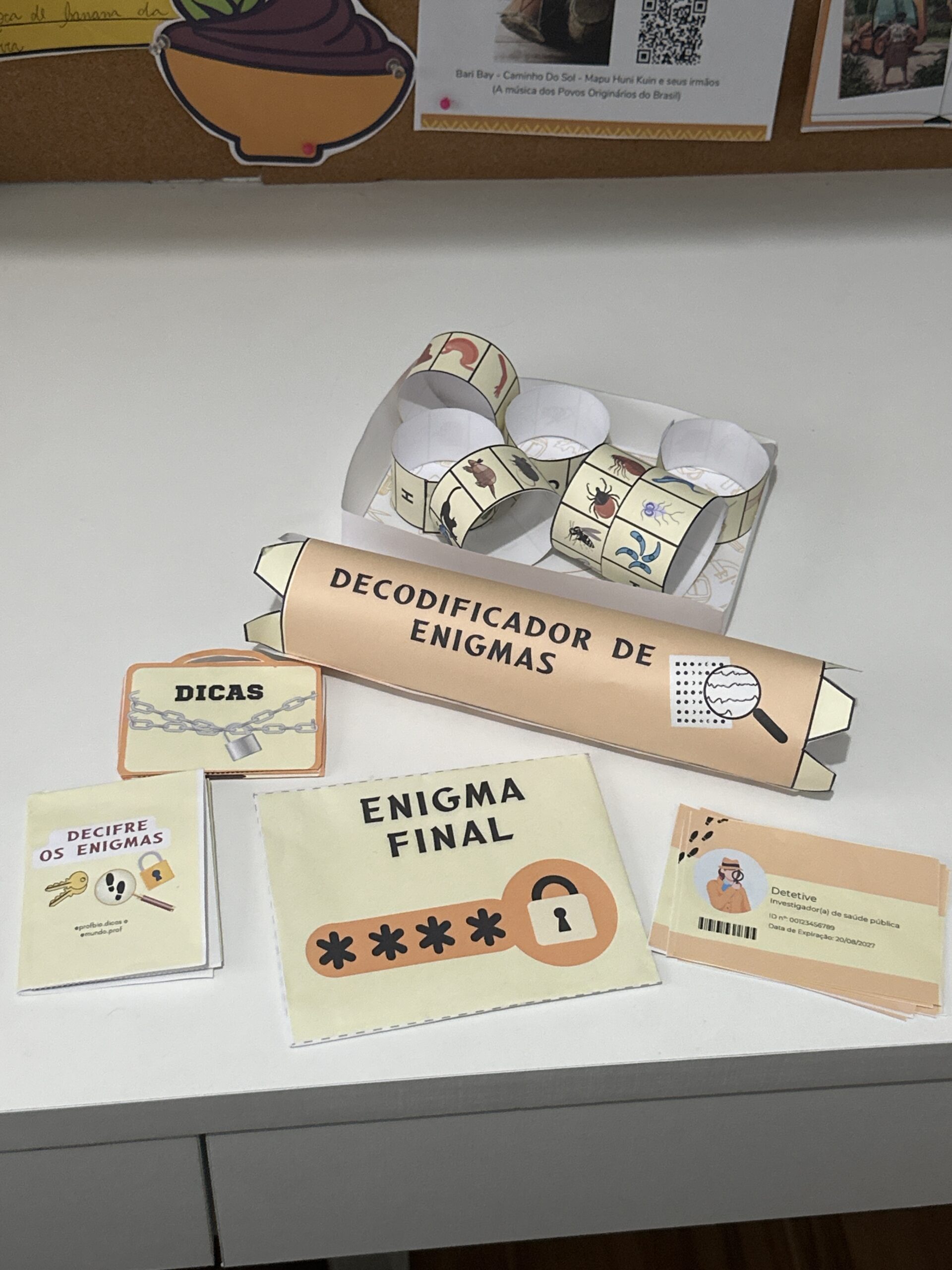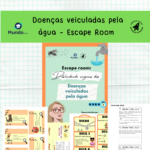 O material em formato PDF no formato de ESCAPE ROOM sobre os Doenças veiculadas pela água acompanha atividades em formato de enigma em versões coloridas e preto e branca, instruções de montagem e sugestão de gabarito.
