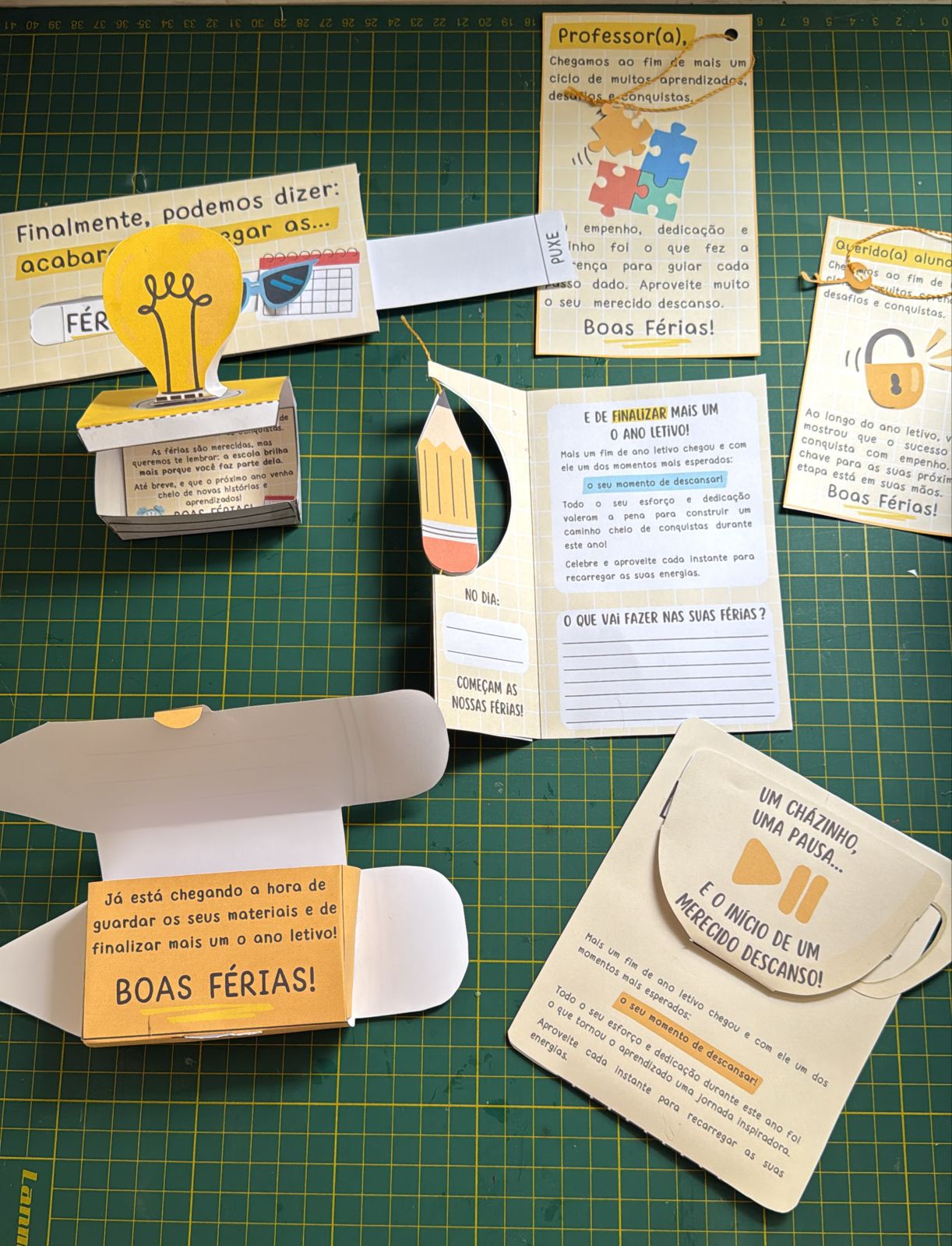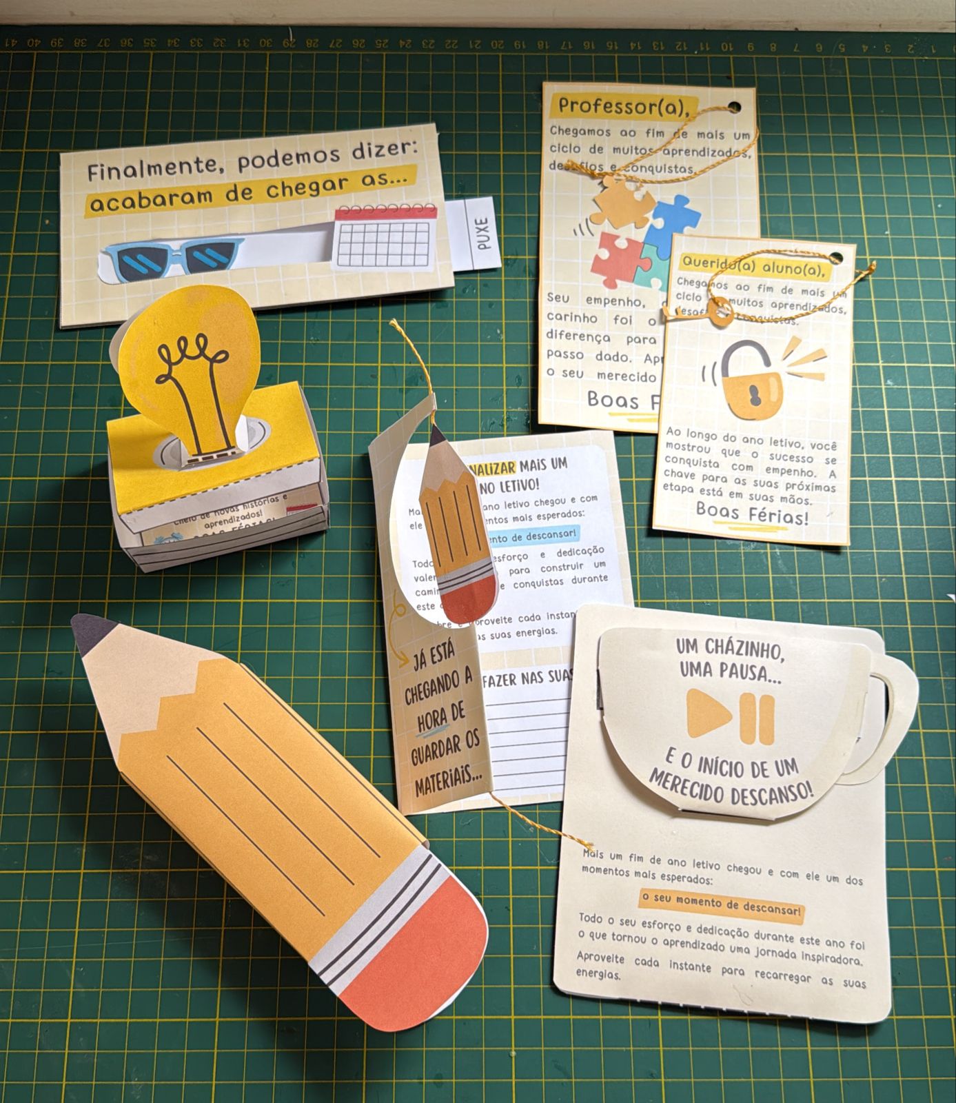 “O material em PDF com 50 páginas é uma proposta de material com atividades e moldes de lembrancinhas interativos para alunos e professores no período de fim do ano letivo. O material conta com moldes para socializar a finalização do ano letivo e promover um momento de interação entre todos da comunidade escolar para motivar e engajar os estudantes e professores a celebrarem o encerramento letivo. O material acompanha instruções, sugestão de gabarito e moldes nas versões colorida e preto e branca.
